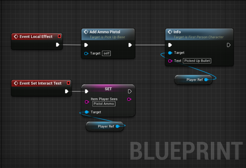 Using a BPI and a local function on the parent pickup, and parent class of anything that can be interacted with allows for the child classes to write-on their individual logic easily. After being picked up and the child logic running the last function that displays a bit of text reminding the player of what they just did, which will be more useful for things that get added to the player's inventory. The overall system for knowing when the player is looking at something to prompt an interaction is a line-trace that runs on every tick when the player is within a certain distance of an interactable. The line-trace is run directly from the center of the camera so it has the highest odds of being where the player is looking.